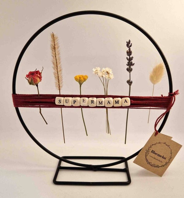 De ring is zwart en heeft een diameter van 20 cm. Kies je favoriete touwkleur. Bloemelot zoekt dan zorgvuldig bijeenpassende droogbloemen en grassen uit en maakt hiermee een mooi boeketje. Standaard wordt de ring gemaakt met de tekst 'supermama'. Wens je liever een andere tekst, kan je in het daarvoor voorziene veld, een korte tekst (maximaal 10 letters) schrijven.